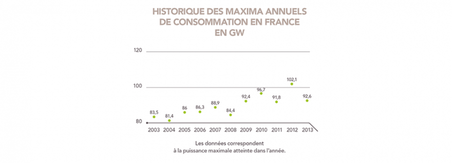 Consommer mieux est une de nos réponses pour faciliter la transition énergétique. L’évolution de nos modes de vie, des nouveaux usages électriques (équipements électroniques, développement du multimédia…) et des usages thermiques de l’électricité (chauffage, pompes à chaleur) ont des conséquences directes sur les pointes de consommation qui sont de plus en plus importantes ces dernières années. En dix ans, ces pointes ont augmenté de 33% et ont atteint des niveaux historiques en février 2012 avec 102 100 MW.